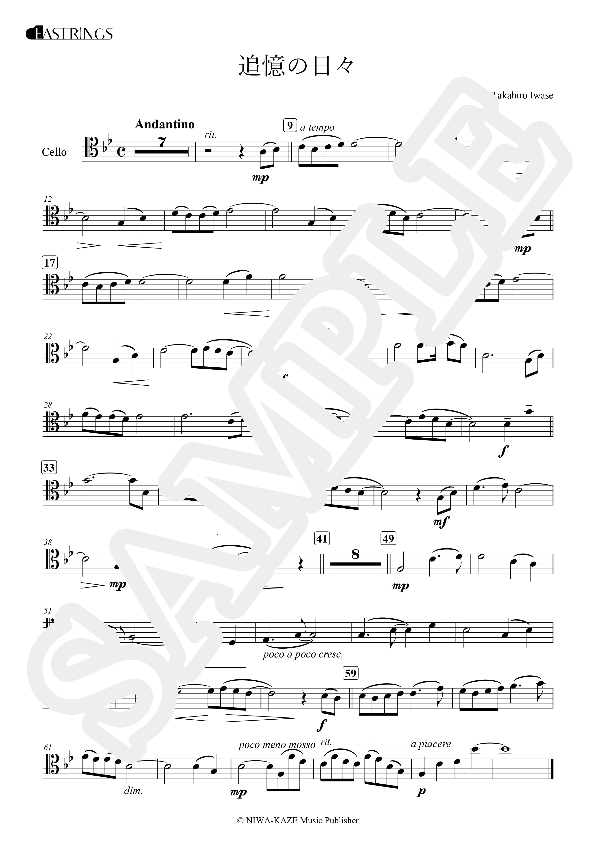 岩瀬貴浩作曲「追憶の日々」のEASTRINGSバージョン(チェロ&ピアノ)スコアです。